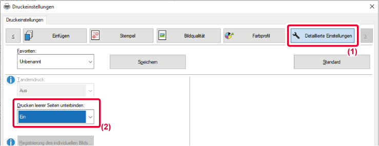 - Wählen Sie unter [Drucken leerer Seiten unterbinden] die Option [Ein] aus.