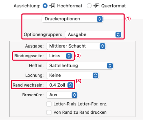 - Wählen Sie die angegebene Ausgabegröße und die Bindungsseite.