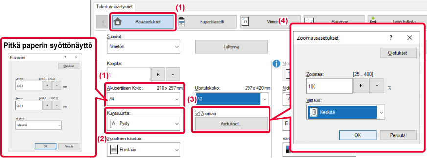 x 17", A4/8-1/2" x 11” ja pitkä paperi.