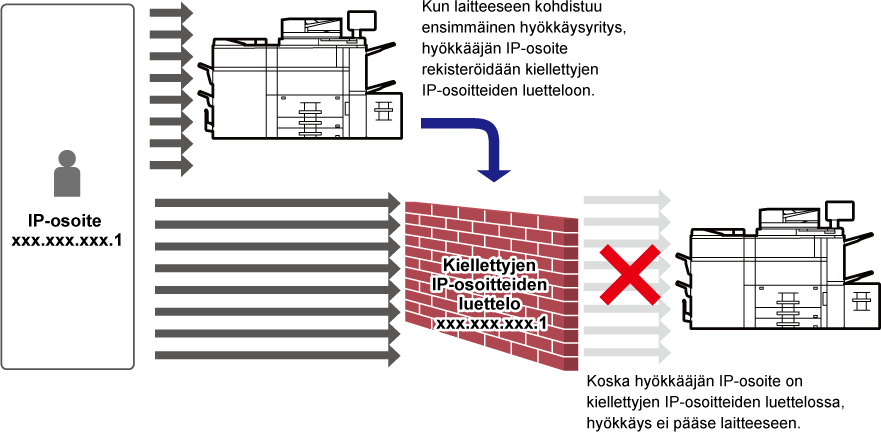 Määritä [Pakota säilytys] tai [Estä työt paitsi tulostuksen pito], kun käytettävä toiminto on asiakirjan arkistointi. Kun [Estä työt paitsi tulostuksen pito] on määritetty, peruutetaan tulostustyöt, joille ei ole määritetty asiakirjan arkistointia tulostinajuriin. |