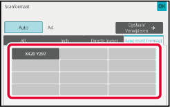 Tik op de toets [Scanformaat] en op vervolgens op de tab [Aangepast Formaat].