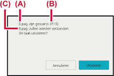 • In het bevestigingsscherm worden het aantal gescande originelen in (A), het aantal gescande zijden in (B) en het aantal te verzenden vellen, uitgezonderd de lege pagina's, in (C) weergegeven. Als er bijvoorbeeld vijf originelen, waaronder twee lege pagina's, dubbelzijdig worden gescand, wordt bij (A) "5", bij (B) "10" en bij (C) "8" weergegeven.