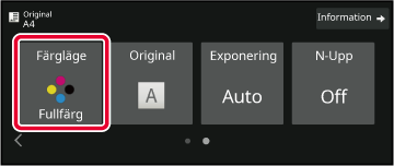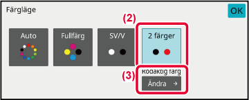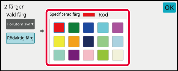 När inställningarna slutförts trycker du på knappen [OK] på skärmen [2 färger] och kontrollerar att den ändrade inställningen visas bredvid knappen [2 färger] på skärmen för färgläge.Originalet kopieras i en färg.