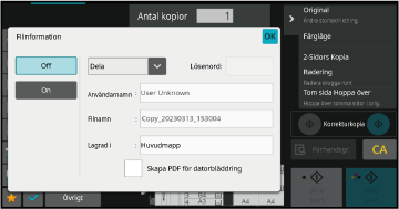 Placera originalet i dokumentinmatningsfacket i den automatiska dokumentmataren eller på dokumentglaset.Byt till normalt läge och tryck på [Fil] på åtgärdspanelen för att ange filinformation.