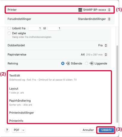 Følgende eksempel forklarer, hvordan der udskrives et dokument fra "TextEdit" in macOS.,