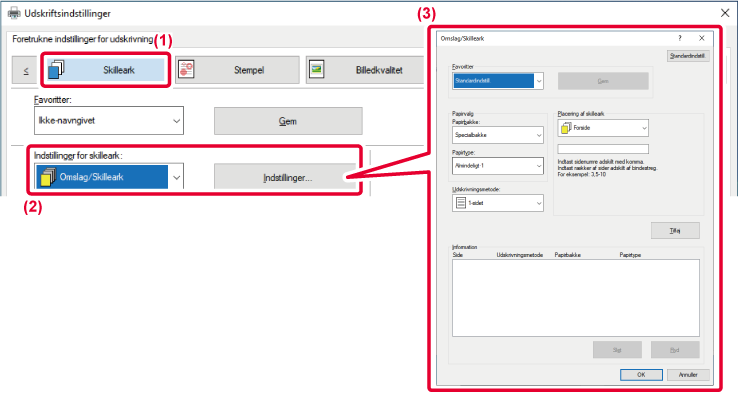 - Vælg papirbakke og papirtype fra "Papirvalg" og separator sideposition i "Placering