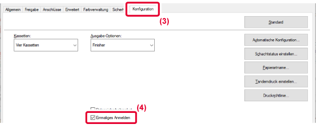 Active Directory muss bereits vorab auf dem Gerät aktiviert sein. Weitere Informationen über Active Directory finden Sie unter "ACTIVE DIRECTORY-LINK-FUNKTION". Wenn Sie Active Directory aktiviert haben, konfigurieren Sie die unten aufgeführten Einstellungen im Druckertreiber.