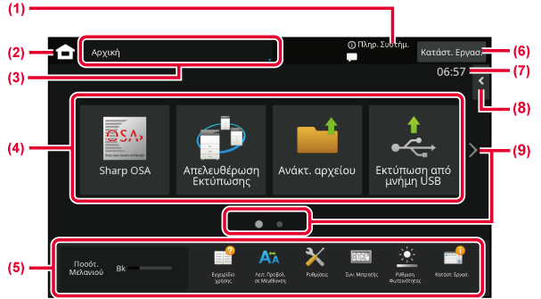 Αν πατήσετε το πλήκτρο [Αρχική Οθόνη], στην οθόνη αφής εμφανίζεται η αρχική οθόνη.