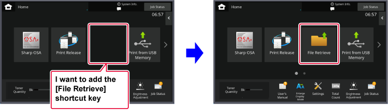The settings are saved in the machine and applied.You can add shortcut keys to the home screen, and delete unneeded shortcut keys.