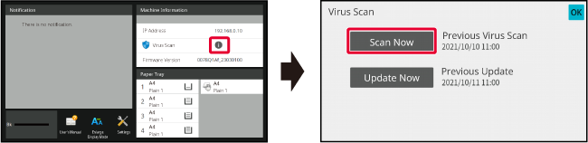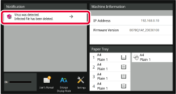 When a virus is detected with respect to the input data, the touch panel will display that a virus has been detected, the input data or the job to be input will be cancelled, and the data or job data that was about to be output will be discarded. Data in the data input source (USB memory, external server, etc.) will not be deleted. When a virus is detected with the output data, the touch panel will display that a virus has been detected, the output data or the job to be output will be cancelled, and the output data or job data will be deleted. The virus detection message will be displayed in the "Notification" of the System Information screen. |