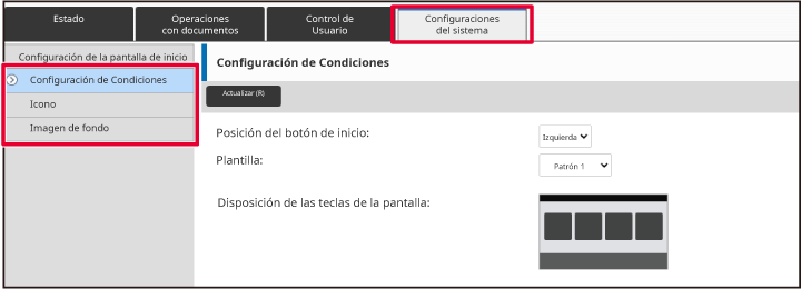 Algunos ajustes pueden requerir que introduzca su contraseña de usuario tras hacer clic en [Configuración de la pantalla de inicio]. Si no realizó la autenticación de usuario, deberá introducir la contraseña de administrador.