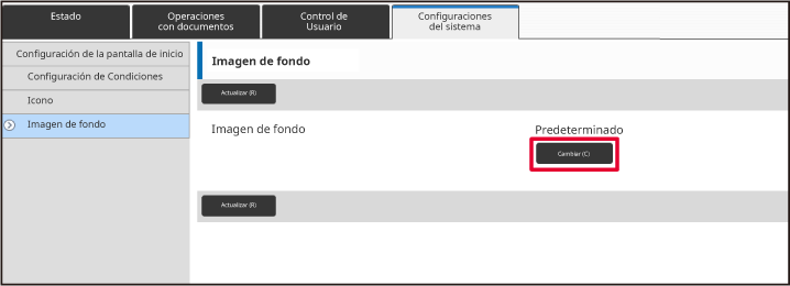 Toque [Configuraciones del sistema] → [Configuración de la pantalla de inicio] → [Imagen de fondo], y después toque la tecla [Cambiar].