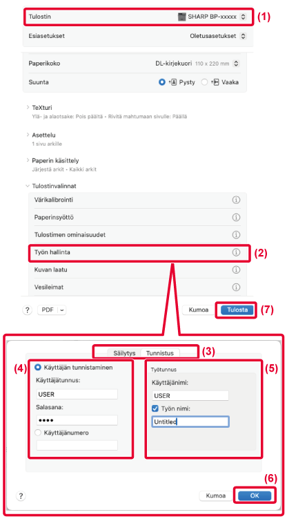 - Syötä tarvittaessa käyttäjänimi ja työn nimi.