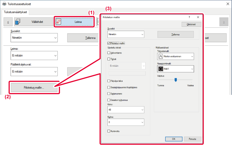 Tämä toiminto tulostaa tulostustietojen taakse mallitietoja, kuten "ÄLÄ KOPIOI".