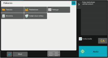 Napauta toimintopaneelissa [Valitse USB-muistista tulostettava tiedosto] tai [Valitse verkkokansiostatulostettava tiedosto].