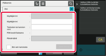 Jos laitteeseen on tallennettu paljon tiedostoja, oikean tiedoston löytämiseen voi kestää jonkin aikaa. Asiakirjojen arkistointitilan hakutoiminto nopeuttaa tiedoston etsimistä.