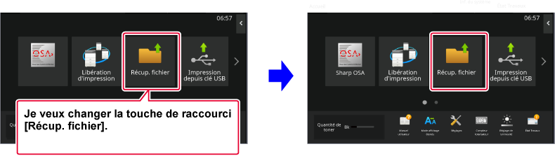 Les réglages sont enregistrés dans la machine et ils sont appliqués.Pour modifier une image de touche de raccourci par une nouvelle image, vous devez