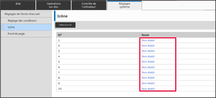 Dans l'état par défaut, vous devez saisir votre mot de passe utilisateur après avoir saisi l'adresse IP.Sur la page Web, cliquez sur l'onglet [Réglages système] → [Réglages de l'écran d'accueil] → [Position du bouton d'accueil].