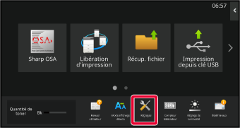 Lorsque le périphérique USB est connecté à la machine, la fenêtre contextuelle s'affiche. Appuyez sur la touche [OK].Touchez la touche [Réglages] dans l'écran d'accueil.
