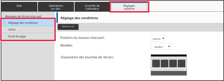 Les réglages sont enregistrés dans la machine et ils sont appliqués.Plusieurs modèles de disposition de l'écran d'accueil sont prédéfinis dans la machine.