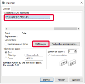 Sélectionnez le pilote d'imprimante pour la machine et cliquez sur le bouton [Préférences].