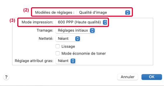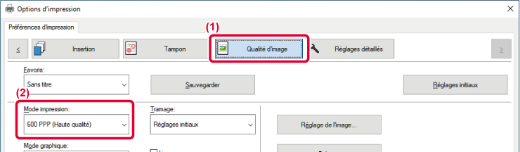 Les trois choix suivants sont disponibles pour le "Mode impression" (résolution) :