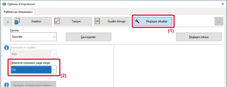 - Sélectionnez [Oui] dans [Désactiver impression page vierge].