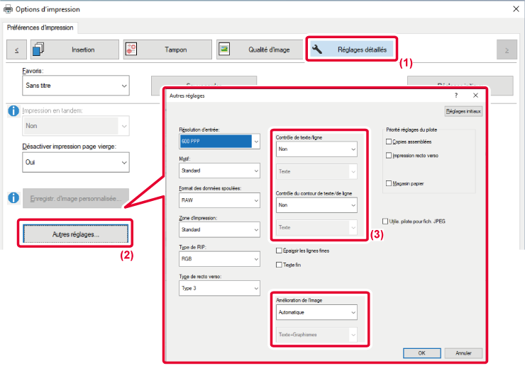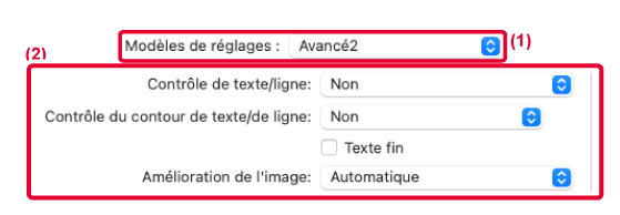 Vous pouvez également rendre les bords de texte et de graphiques plus ou moins épais. Auto. : permet d'améliorer l'image de façon optimale. Off : aucune amélioration de l'image n'est appliquée. Netteté : l'amélioration de l'image est appliquée de façon nette. Léger : l'amélioration de l'image est appliquée de façon légère. |