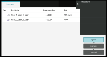 Lorsque vous appuyez sur l'écran d'état des travaux, les travaux s'affichent sous