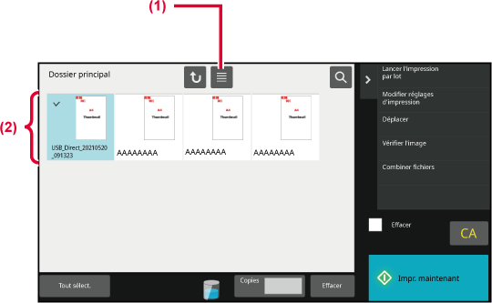 - Le nombre d'exemplaires défini dans [Copies] est validé en appuyant sur [Impr. maintenant].