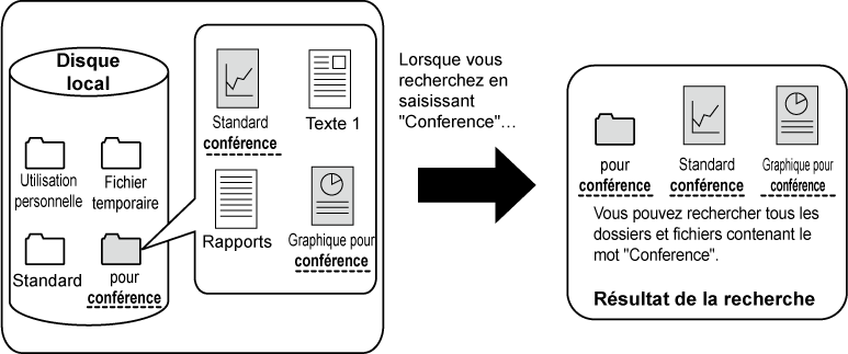 La recherche est possible même si vous ne connaissez qu'une partie du nom du fichier ou du dossier. Si nécessaire, un dossier peut également être choisi comme plage de recherche.