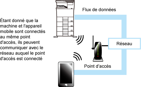 La machine et l'appareil mobile peuvent communiquer via le réseau avec un point d'accès