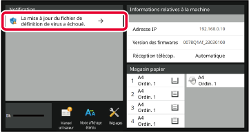 Lorsqu'un virus est détecté dans les données d'entrée, l'écran tactile affiche qu'un virus a été détecté, les données d'entrée ou le travail à entrer sont annulés et les données ou le travail qui étaient sur le point d'être envoyés sont supprimés. Les données de la source d'entrée de données (mémoire USB, serveur externe, etc.) ne sont pas supprimées. Lorsqu'un virus est détecté avec les données de sortie, l'écran tactile affiche qu'un virus a été détecté, les données de sortie ou le travail à envoyer sont annulés et les données de sortie ou le travail sont supprimés. Le message de détection de virus est affiché dans la "Notification" de l'écran Informations système. |