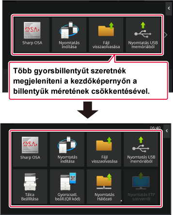A készülék menti és alkalmazza a beállításokat.Ez a rész azt mutatja be, hogyan lehet parancsikonokat módosítani a kezdő képernyőn.