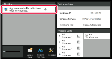 Nella "Notifica" della schermata Informazioni di sistema viene visualizzato il messaggio sul rilevamento del virus e sulla necessità di rivolgersi a un centro di assistenza. La macchina continuerà a lavorare. |