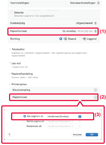 - Selecteer [Handinvoer (Envelop)] of [Lade 1] in het menu “Alle pagina's uit”.