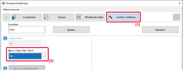 - Selecteer [Aan] bij [Blanco Pagina Afdr. Uitsch.].