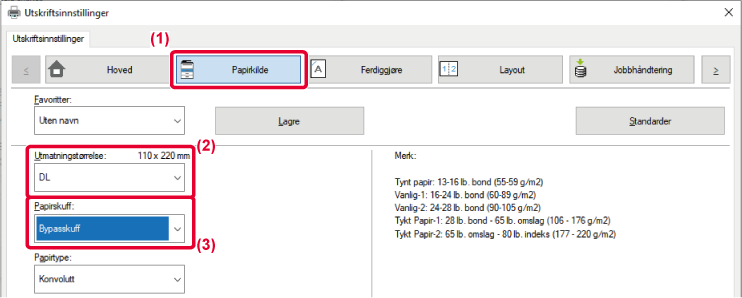 Når [Utmatningstørrelse] settes til konvolutt, settes [Papirtype] automatisk til [Konvolutt].