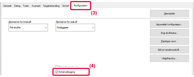 Active Directory må på forhånd være aktivert på maskinen. Gå til "KOBLINGSFUNKSJON FOR ACTIVE DIRECTORY" hvis du vil ha informasjon om Active Directory. Når du har aktivert Active Directory, konfigurerer du innstillingene nedenfor i skriverdriveren.
