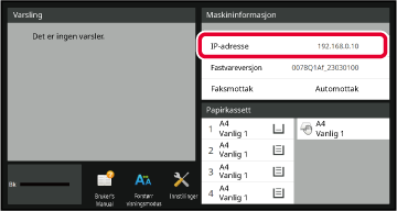 Fra innstillingsmodusen på maskinen, skriv ut IP-adressen til maskinen og skriv inn