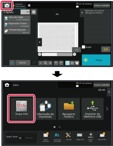 Premir a tecla [Ecrã Inicial] apresenta o ecrã inicial no painel tátil. o qual contém