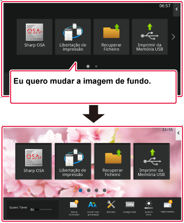 Toque em [Definições de Sistema] → [Definição de ecrã inicial] → [Imagem de fundo] e depois na tecla [Alterar].