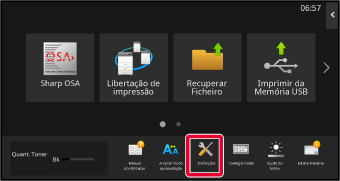 Se estiver ligado um dispositivo USB à máquina, aparece uma janela de pop-up. Toque na tecla [OK].Premir a tecla [Definições] no Ecrã Inicial.