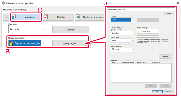 - Selecione [Páginas de rosto/inserções] em [Opção inserções], e clique no botão [Configurações].