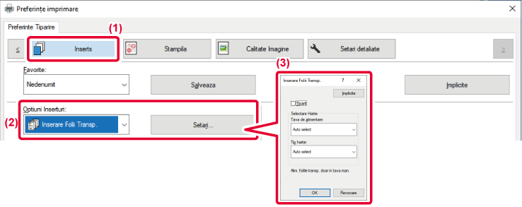 - Selectaţi [Inserare Folii Transp.] şi executaţi clic pe butonul [Setari].