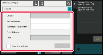 • Puteţi de asemenea utiliza funcţia de căutare fişiere în modul setare (versiune Web). Apăsați pe [Operatii document] în "Setări (versiune web)" → [Memorare documente] → [Căutare].