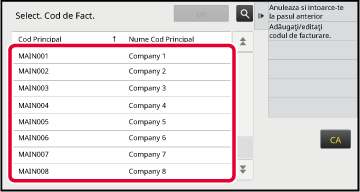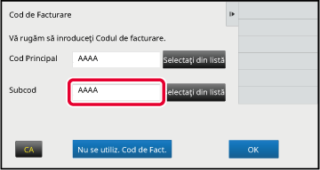 Când este afişată fereastra de introducere a codului de facturare, atingeţi tasta codului principal [Selectaţi din listă].