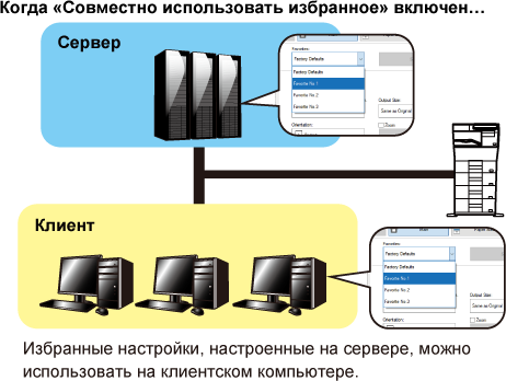 в драйвере принтера на сервере совместного доступа установлено "Избранное", эту настройку