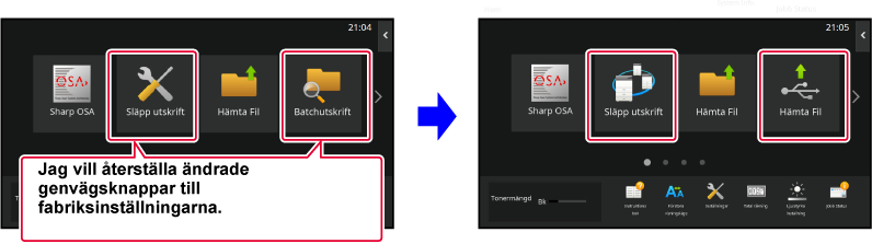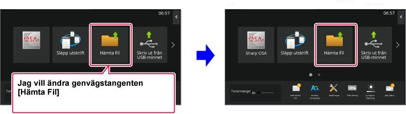 Inställningarna lagras i maskinen och aktiveras.Det här avsnittet beskriver hur du ändrar en snabbknapp på startskärmen.