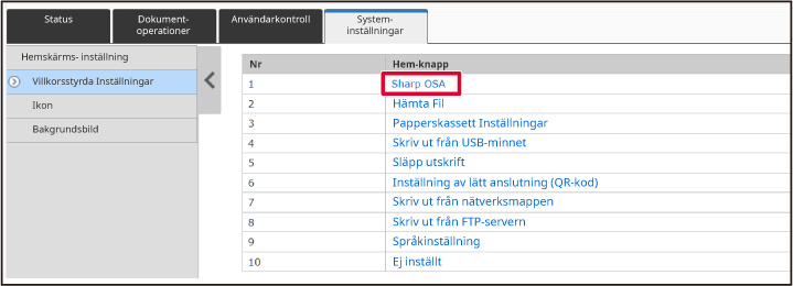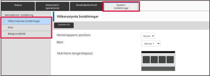 När fabriksinställningarna är aktiva måste du ange ditt användarlösenord efter det att du angett IP-adressen.Klicka på fliken [Systeminställningar] →[Hemskärms inställning]→ [Hemknappens position] på webbsidan.